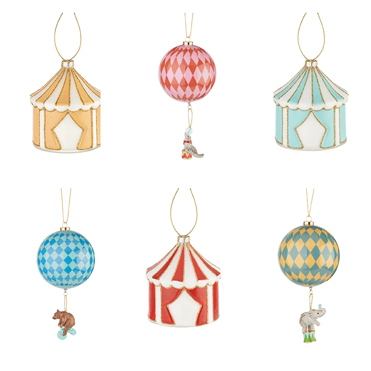 O conjunto de 6 enfeites de Natal para pendurar na árvore, com tema de circo, da L'Oca Nera, é perfeito para tornar sua decoração de Natal única e espetacular. Cada peça, elaborada com atenção aos detalhes, evoca a atmosfera mágica do circo natalino com cores vibrantes, acabamentos refinados e um design original.