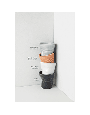 Revol e Ressource combinaram suas habilidades e conhecimentos para criar seis novas cores para as xícaras Froissés – cores exclusivas, ricas e matizadas e que se complementam. Nem cinza, nem cinza, nem azul, o grafite é a própria essência de uma cor forte que não se pode descrever como escura. Simplesmente existe. Esta cor lembra rochas criadas no calor das erupções, pedra vulcânica intensamente fosca e telhas de ardósia. Assemelhando-se a um passeio na natureza pura, as cores de Revol e Ressource são multifacetadas: tons de água, céu, plantas e pedras que trabalham em harmonia entre si.