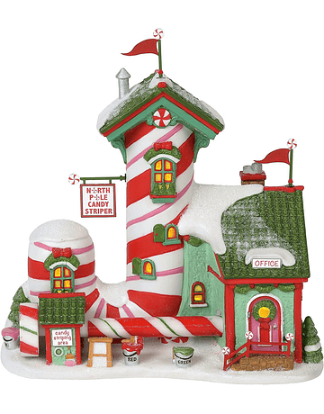 De que outra forma você acha que os bastões de doces têm suas listras deliciosas? O edifício apresenta um grande bastão de doces de cabeça para baixo na lateral com lindas listras rosa e vermelhas! A frente do prédio tem a área de distribuição de doces, onde um bastão de doce gira para obter suas listras! IFeito de porcelana.Pintado à mão . Iluminado.