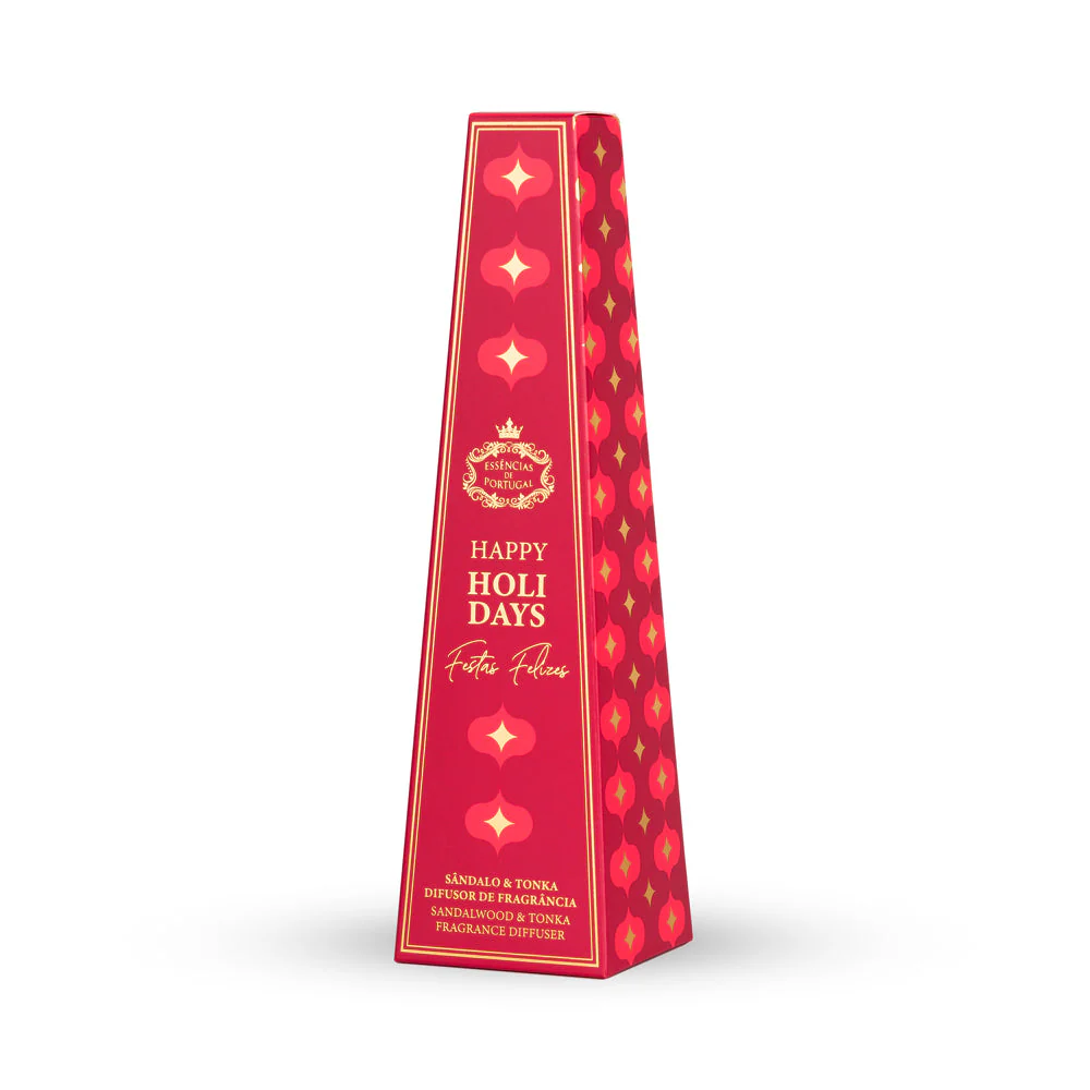 O seu frasco dourado e a embalagem festiva em tons de vermelho e dourado refletem o espírito das noites luminosas de inverno, tornando-o uma peça aromática e decorativa perfeita para qualquer ambiente.