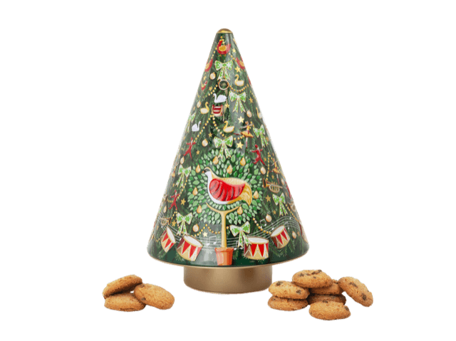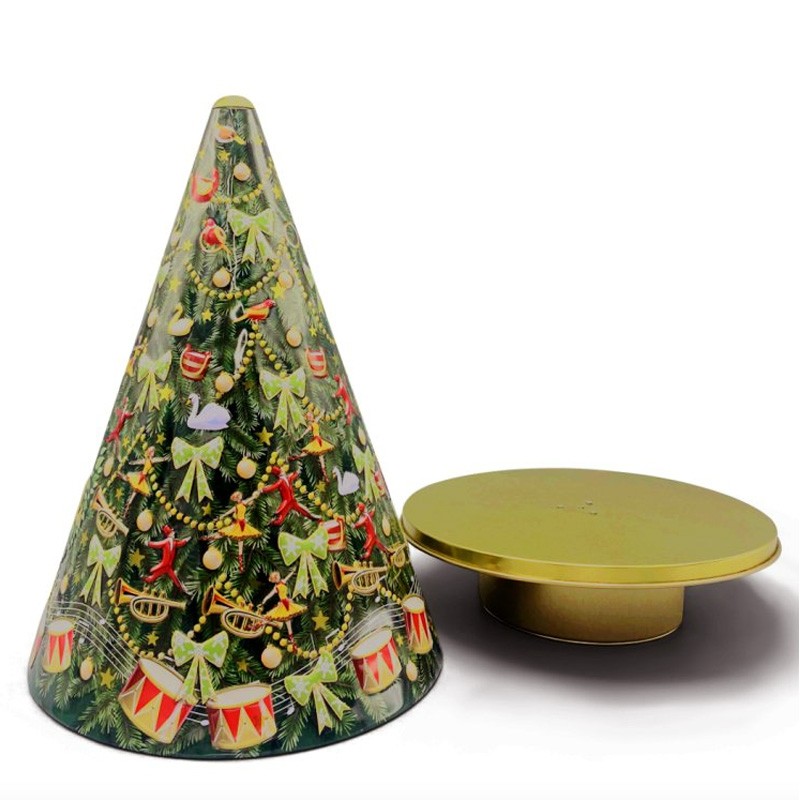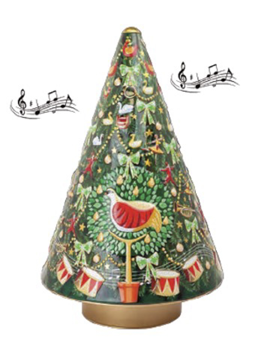 Lata em forma de árvore com caixa de música rotativa. Ideal para armazenamento. Apta para uso alimentar. Volume 2400ml. Dimensões: D18xA31cm. Marca Silver Crane.