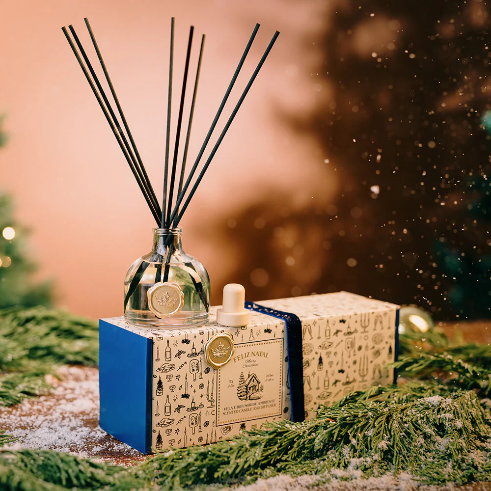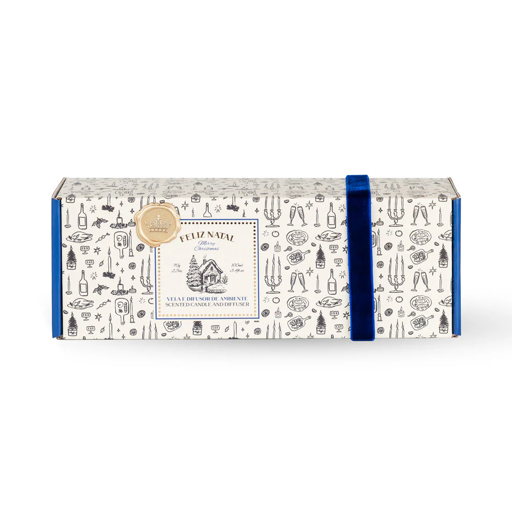 A embalagem ilustrada, adornada com fita de veludo azul e lacre dourado, reflete o requinte e o espírito festivo que caracterizam a época natalícia — tornando este pack o presente perfeito para perfumar e iluminar o lar com elegância e harmonia.