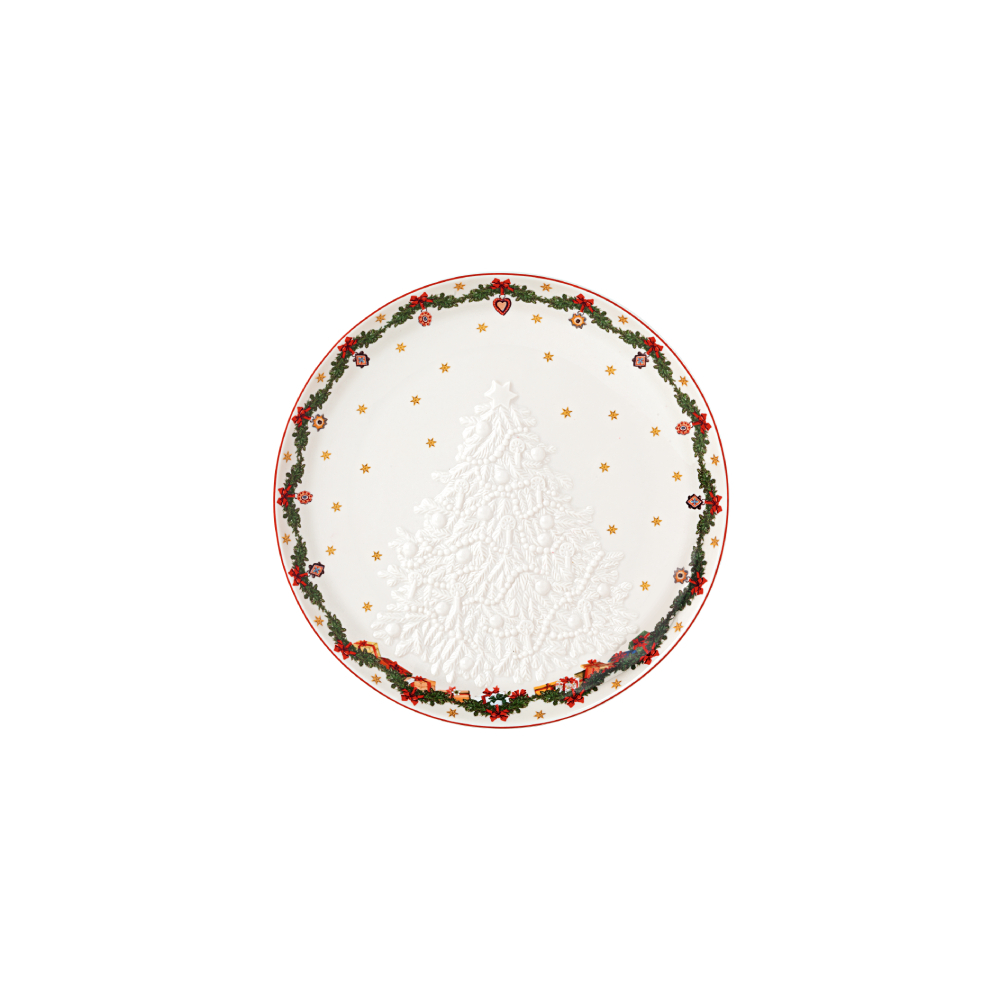 Prato decorativo com uma árvore de Natal em relevo, que acrescenta textura e um toque especial à mesa festiva. Perfeito para servir bolos, doces ou entradas, destaca-se pela originalidade e pelo espírito natalício que traz a cada refeição.